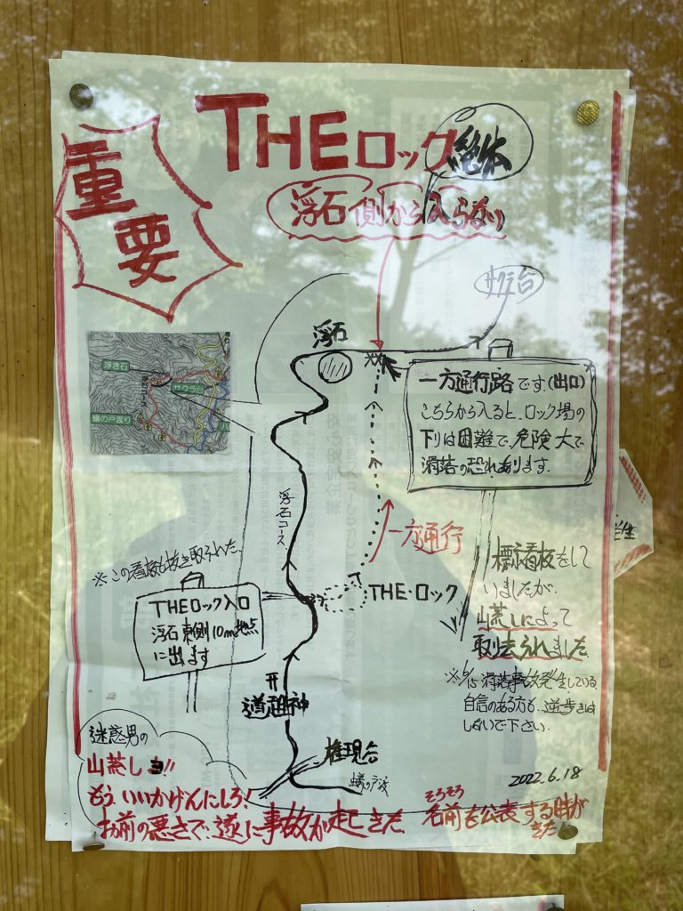 そして世の中悪い奴がいるもので、道(コース)の分岐とかにある目印の看板を引っこ抜き捨ててしまう山荒らしなる輩が存在するみたいで、管理?している方の激おこ貼り紙が貼ってありました。